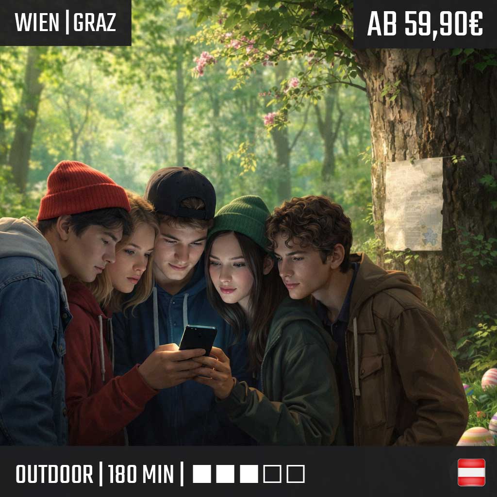 MEHR INFOS & TICKETSAm Karsamstag ist es endlich wieder soweit - wir veranstalten zwischen 15:00 und 18:00 Uhr in Wien und in Graz unsere große Oster-Challenge, bei der ihr gemeinsam mit Freunden und/oder Familie gegen über 100 andere Teams in Echtzeit antreten könnt. Was erwartet euch? Ein riesiger Spielbereich mit 30 zu Ostern passenden Rätselstationen mit unterschiedlichsten Aufgaben in drei Schwierigkeitsgraden.